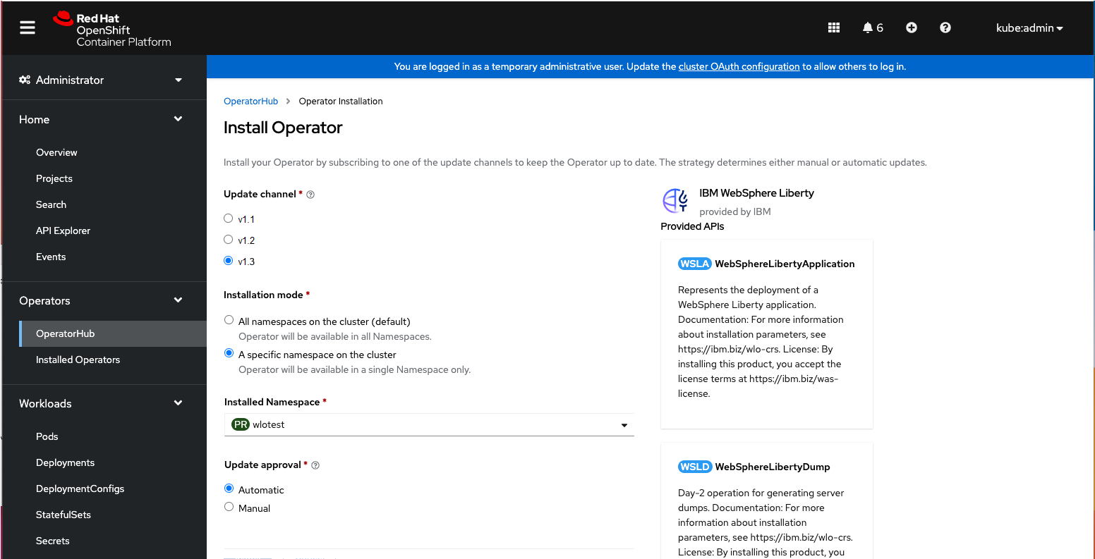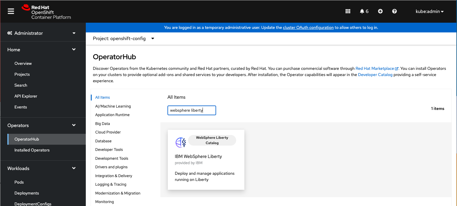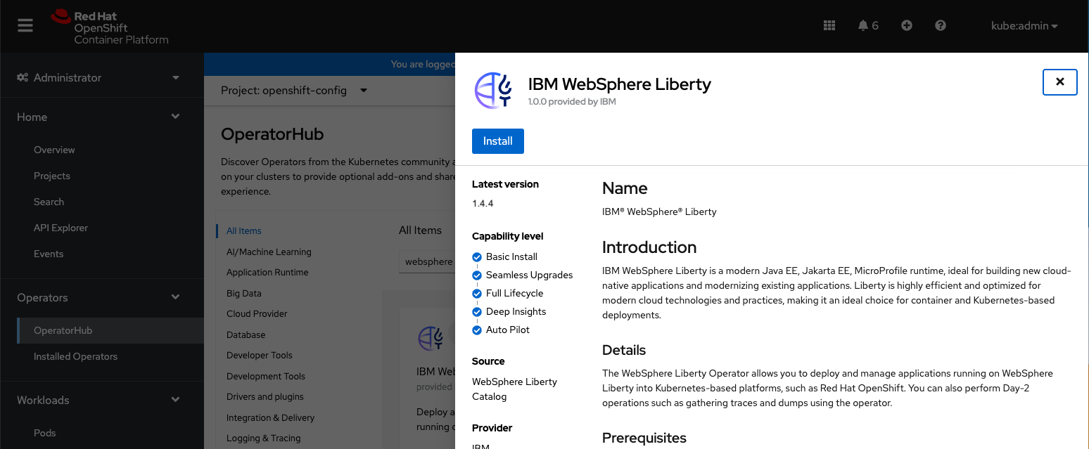 Install WebSphere Liberty operator with the Red Hat OpenShift console