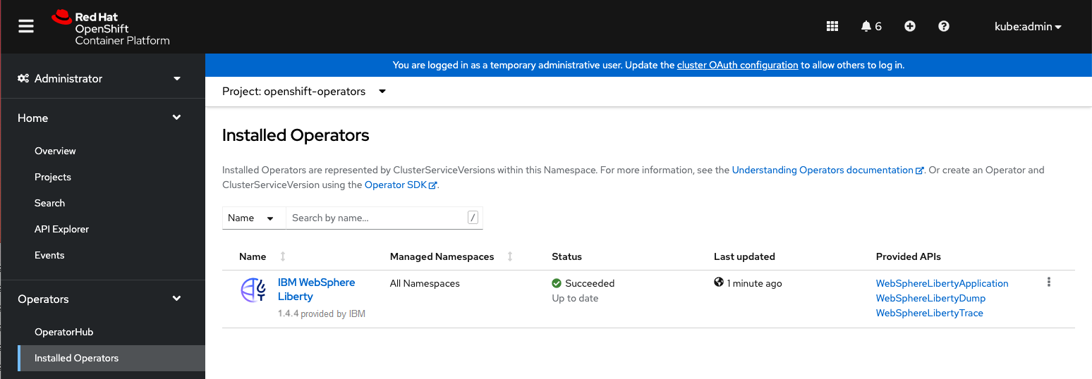 If the installation completes, the WebSphere Liberty operator is successfully installed on your Red Hat OpenShift cluster.