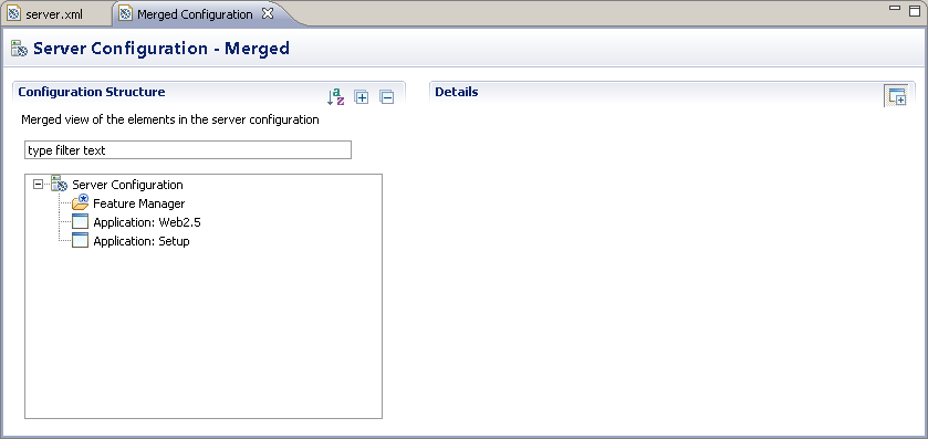 Look under the Configuration Structure sections to see the difference between the Server Configuration editor and Merged Configuration view. The Merged Configuration view replaces the Include: common.xml element from the Server Configuration editor with Application: Setup element.