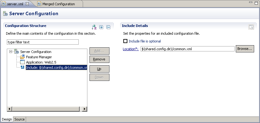 This is a screen capture of the Server Configuration editor that uses the Include element to embed the common.xml file into the server.xml configuration file: