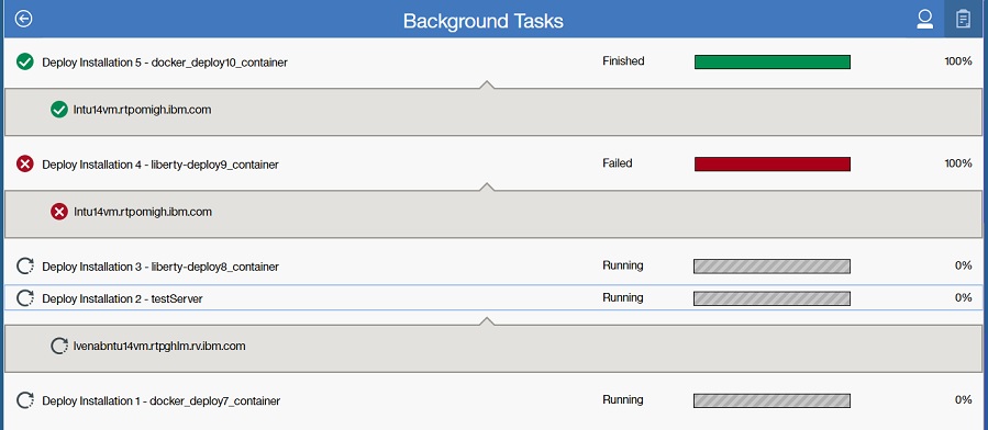 Select a task row to see hosts. If we are deploying a server package to multiple hosts, a list of the hosts is shown under the task.