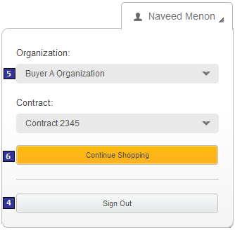 Figure 3. Sign In/Register panel: buyer is signed in, participates in more than one organization, and is entitled to more than one contract.