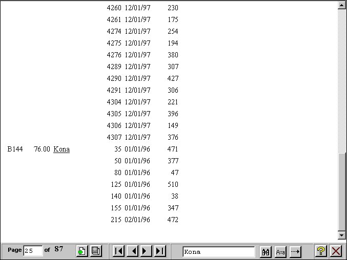 You want to use the Viewer Control Panel to navigate a long report called Coffee Sales to find occurrences of the string "Kona," a type of coffee that you sell. After you run the report, DB2 Web Query displays the first page of the report in the Viewer.