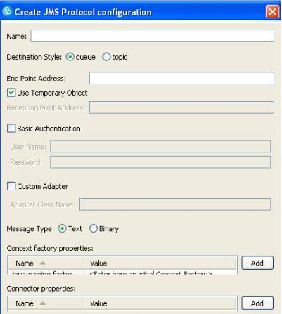 Basic authentication The User Name and Password that are used for basic authentication. Custom adapter class name Set up a custom JNDI vendor adapter for this configuration. To use a custom adapter, you must write a Java class that extends the Axis class and methods. Specify the name of your custom adapter class in Adapter class name. Text message Specify whether the message is a text or a byte message. Context factory properties Edit the properties for a context factory. Click Add to add string properties to the context factory configuration. Connector properties Edit the properties for a connector. Click Add to add string properties to the connector configuration. The product supports the following connectors: