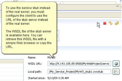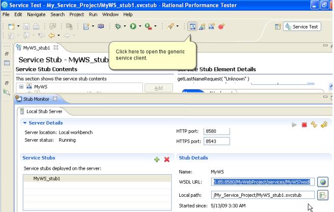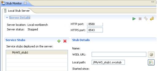 The local stub server runs in the workbench on the local computer. Service stubs can be accessed locally or over the network by client applications or service tests. The local stub server is automatically stopped when you close the workbench.