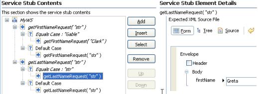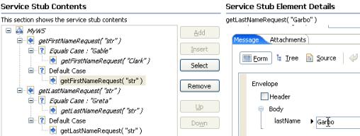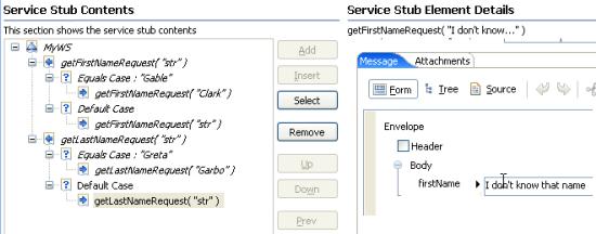 - Select the response element and edit the Message content to specify the XML content returned by the service stub.