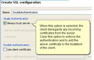 Always trust server Select if no authentication is required or to ignore server certificates so that all servers are trusted. If you are using single authentication and to accept trusted servers only, then disable this option and specify a truststore containing the trusted server certificates.