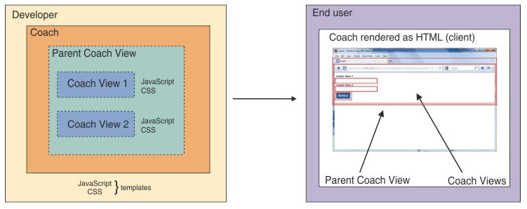 Coaches contain one or more Coach Views. The Coach Views provide the user interface elements and layout for the Coach. Each Coach View can contain one or more other Coach Views, which creates a parent-child relationship between these Coach Views. At run time, the parent Coach View is rendered as a <div></div> tag that contains a nested <div></div> tag for each child Coach View. Each Coach View can also have a binding to a business object, CSS code to control its visual layout, and JavaScript to define its behavior.
