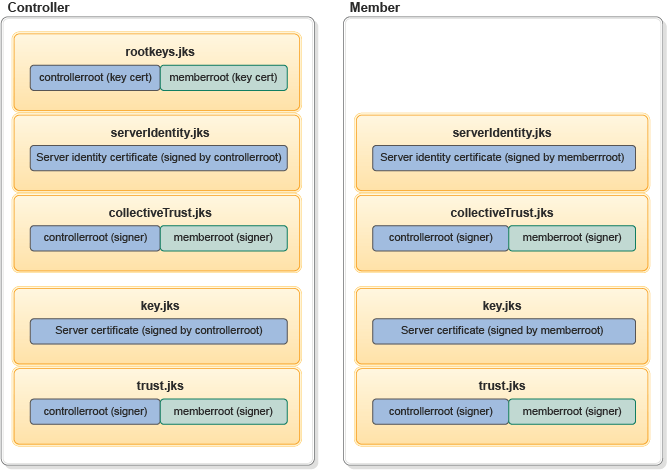 - Replace the controllerroot signer and memberroot signer contained in the collectiveTrust.p12 file and the trust.p12 file.
