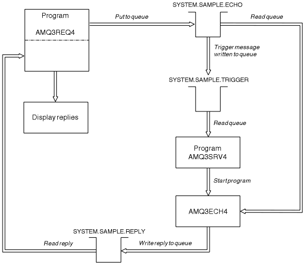 Table 63. Client/Server sample program details Program name SYSTEM/SAMPLE queue Program started Echo ECHO AMQ3ECH4 Inquire INQ AMQ3INQ4 Set SET AMQ3SET4