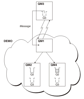 In this scenario, the queue manager outside the cluster (QM3 in Figure 1) needs to put messages to the queue Q2, which occurs on two queue managers within cluster DEMO, and to exploit workload balancing. A queue named Q2 occurs on the queue managers QM2 and QM4 but not on the gateway queue manager QM1.