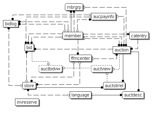 The Auction data model shows the relationship between the main database tables that contain information about auctions.