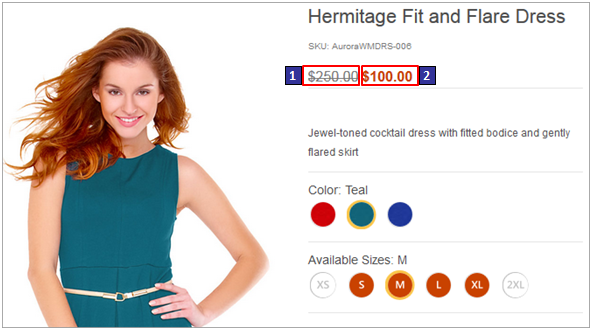 When you publish a WebSphere Commerce starter store, the starter store uses two default price rules for pricing. These simple price rules pull prices from the default Offer Price and List Price lists and display them on the storefront. The following illustration shows the product display page for a Hermitage Fit and Flare Dress: