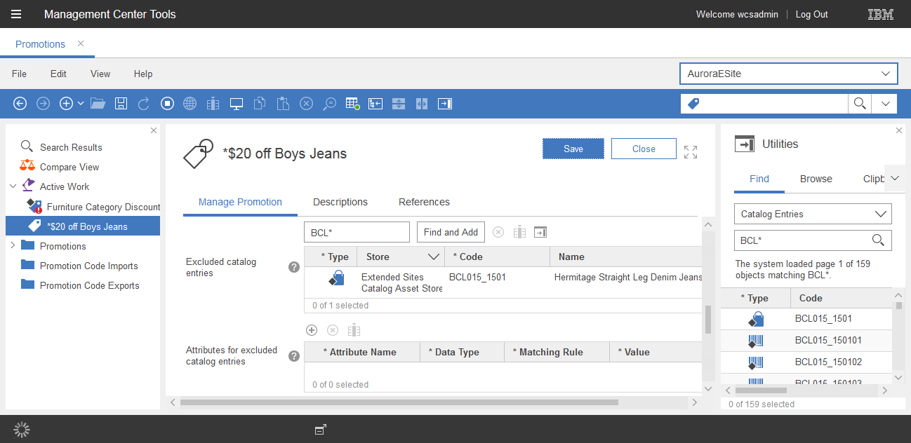 While working on the current object, we can associate it with another object. For example, we can associate a product with a merchandising association or a web activity with a customer segment. Many properties views in Management Center contain tables for finding and associating objects.The following screen capture shows the Catalog entries table, which is a typical example of a table that we use to find and associate objects. In this case, the table associates catalog entries to a promotion. The right pane shows the Find and Browse tabs in the utilities view. We can use the utilities view to search or browse for objects, and the drag the objects into the table
