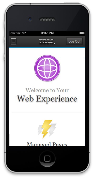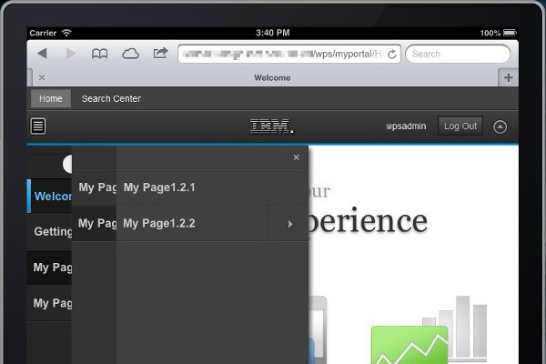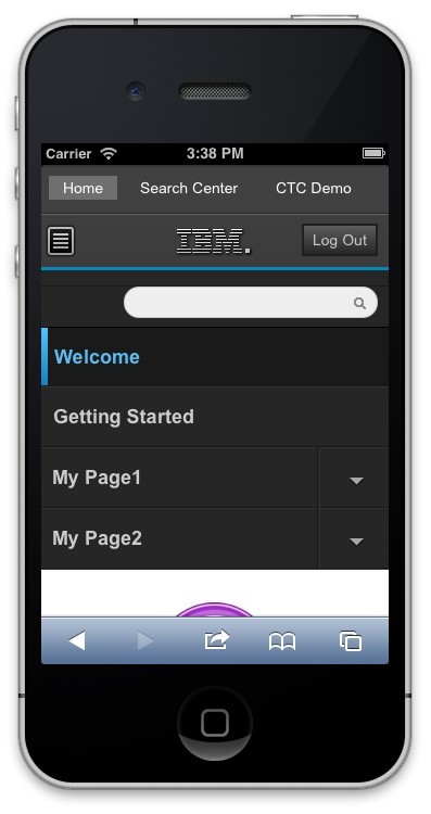 The navigation on mobile devices is rendered by the mobileNavigation.jsp file. Therefore, the primary, secondary, breadcrumb, and side navigation used on the desktop do not produce any output for a mobile device. The navigation is rendered for mobile, but is hidden when the page loads. On a tablet, the arrow button in the banner can be tapped to reveal the navigation. On a smartphone, the user can scroll up to see the first-level navigation pages. Since smartphones have little real estate, site designers might want to hide certain first-level pages, such as Administration, for these devices. Add the com.ibm.portal.mobile.Hidden metadata to the page to hide certain first-level pages. By default, the Administration, Application, and Tag Center pages are hidden.