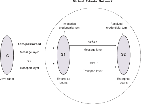 In the administrative console, the S1 server is configured for incoming requests to support message-layer client authentication and incoming connections to support SSL without client certificate authentication. The S1 server is configured for outgoing requests to support identity assertion.