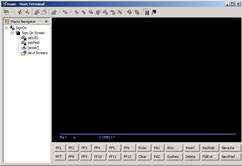 - Open the HATS terminal window for SignOn macro. In the left pane of terminal window, select SignOn. Click the Record Macro button.