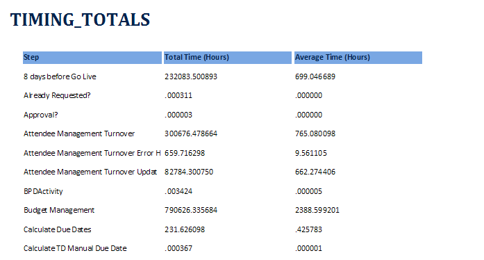 - Group the data by timing interval name and filter the results to limit them to the BPD named MPR Program Planning; this is possible because Lombardi names the timing intervals: activity_name (bpd_name)
