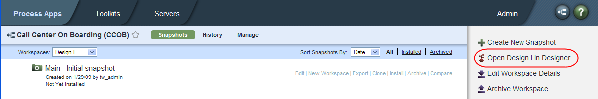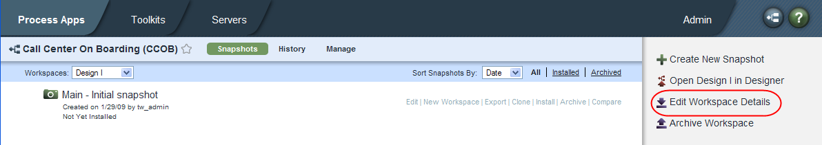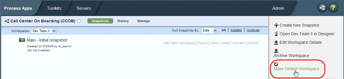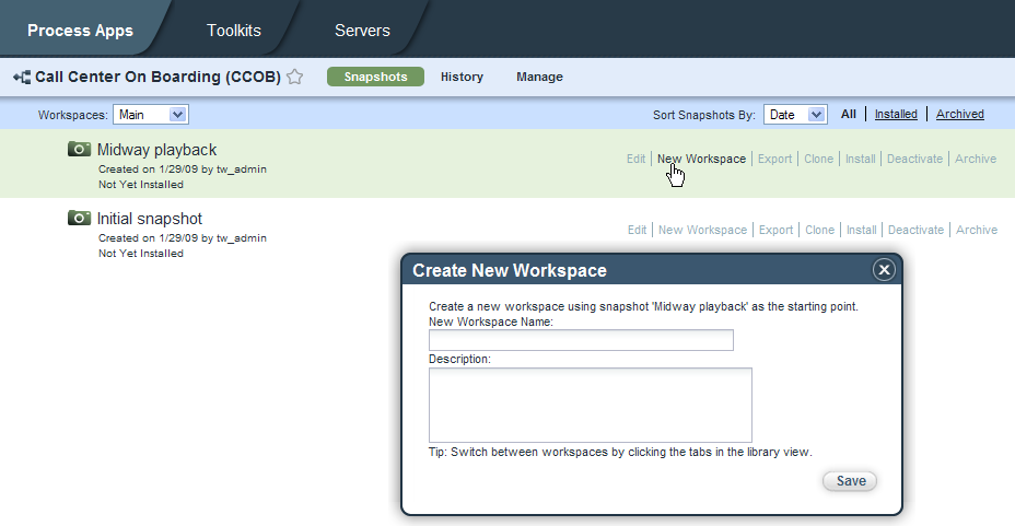 Administrators can now create additional workspaces in the selected process application or toolkit