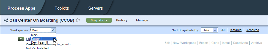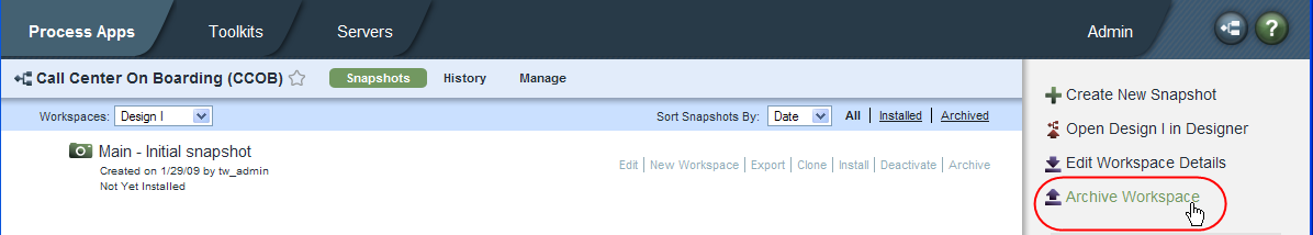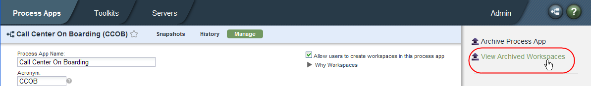 To view or restore archived workspaces, click the Manage option for your process application or toolkit and then click the View Archived Workspaces option shown in the following image: