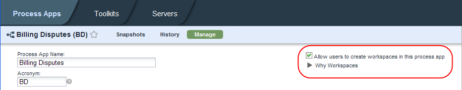 You can enable and manage workspaces for the process applications and toolkits that you create or to which you have administrative access. To learn how to manage user accounts and authorizations.