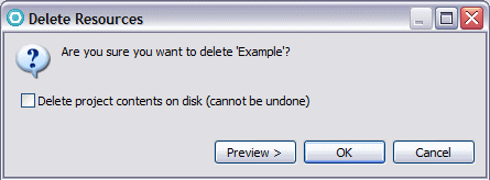 Figure | -10 shows the Delete Resources dialog presented when deleting a project. The default only removes the project from the workspace and leaves the project files on disk intact. Select the option box if you want to remove the project completely. Its important to realize that deleting a project from disk is permanent and the project cannot be opened again. If a project is only removed from the workspace, then it can later be imported by selecting File Æ Import Æ General Æ Existing Projects Into Workspace. A project that has been deleted from the workspace takes up no memory and is not examined during the build process. Deleting projects from the workspace can improve the performance of Rational Application Developer.