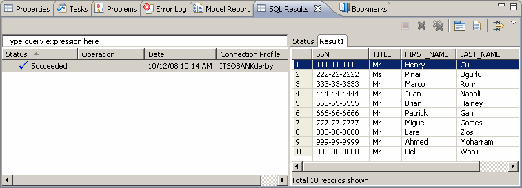 In the Data Source Explorer view, right-click the Customer table and select Data Æ Sample Contents. The action opens the SQL Results view, and the running result is Succeeded. Highlight the Succeeded run and then select the Results1 tab to see the list of customers (Figure | 1-5).