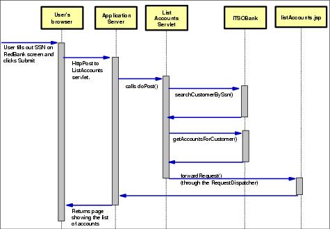 UpdateCustomer-Updates the customer information. The first three servlets use a simple function call from the servlet to the model classes to implement their controller logic and then use the RequestDispatcher to forward control onto another JSP or HTML resource. The pattern used is shown in the sequence diagram in Figure | 3-9.