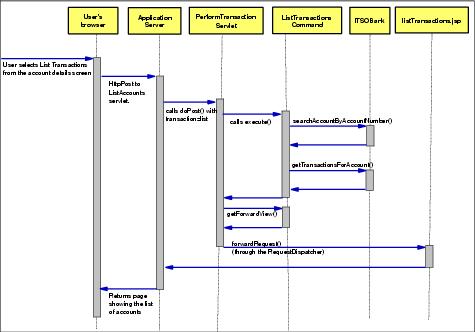 PerformTransaction uses a different implementation pattern. It acts as a front controller, simply receiving the HTTP request and passing it to the appropriate control action object. These objects are responsible for carrying out the control of the application. Figure | 3-10 shows a sequence diagram for the list transaction operation from the account details page, including the function calls through PerformTransaction, the ListTransactionsCommand class, onto the model classes, and forwarding to the appropriate JSP.