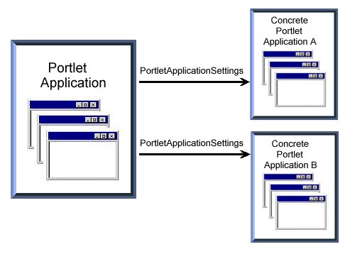 A concrete portlet application is a portlet application parameterized with a single PortletApplicationSettings object. For each portlet application there may be many concrete portlet applications. PortletApplicationSettings are read/write accessible and persistent. There is no object that explicitly represents the concrete portlet application.