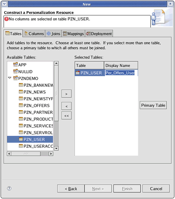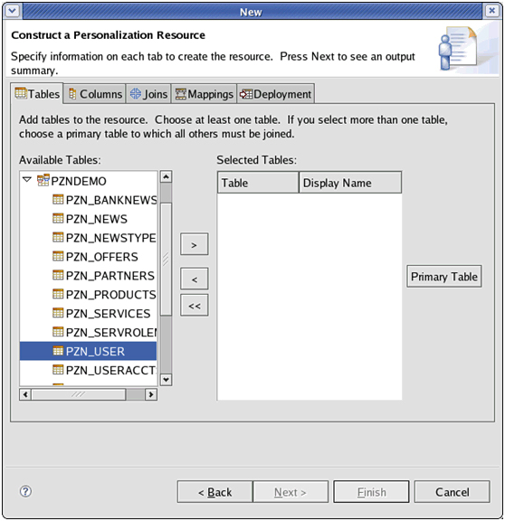 - On the Tables tab, highlight PZN_USER by single clicking on it. Click the appropriate arrow button to select the table.