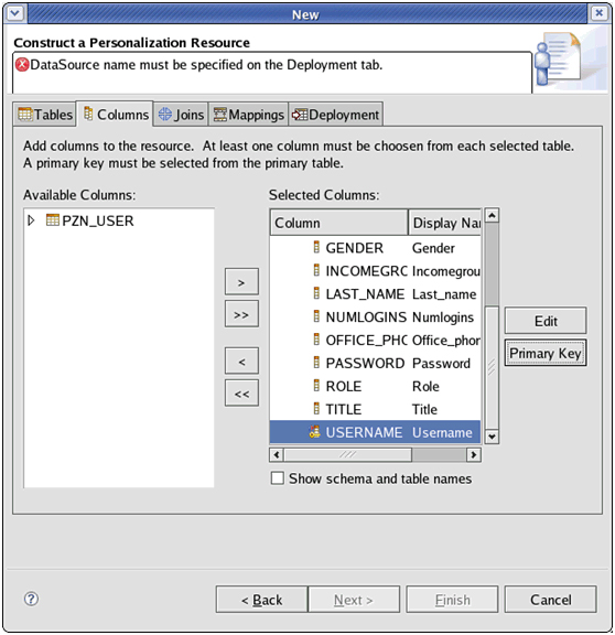 - On the Columns tab, move all of the columns to the selected columns area by clicking the double arrow button. Notice the primary key is the column USERNAME.