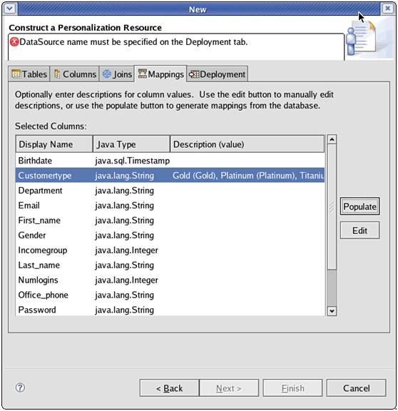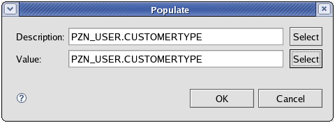 - Click the Select buttons and expand PZNDEMO > PZN_USER to select CUSTOMERTYPE for the Description and Value fields. Click OK.