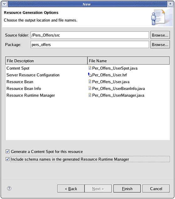 - Set the package name as pers_offers. Select Generate a Content Spot for this resource. Select Include schema names in the generated Resource Runtime Manager.