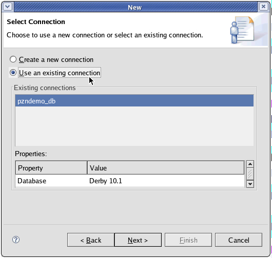 - Select Use an existing connection and select pzndemo_db from the list of existing connections.