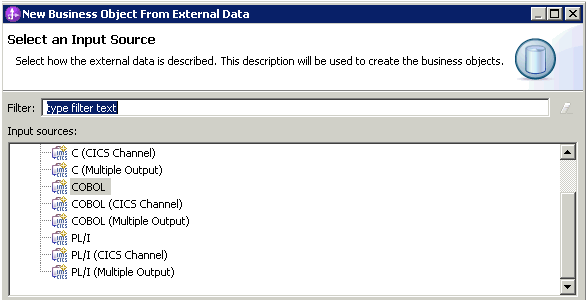 For example, as shown below, you can create a business object from COBOL. WOLA does not support business object creation using the COBOL (CICS Channel) option.