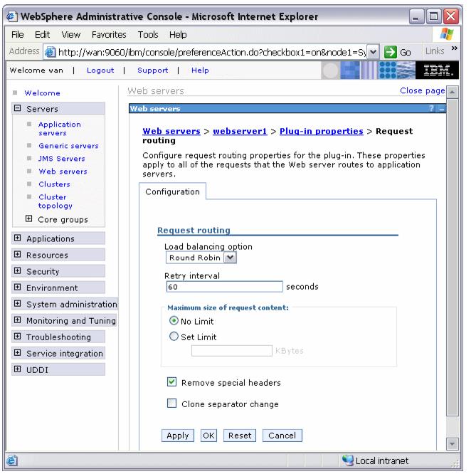 Load balancing option This field corresponds to the LoadBalanceWeight element in the plugin-cfg.xml file. The load balancing options are covered in detail in WAS V6 Scalability and Performance Handbook, SG24-6392. The following items are short overviews.