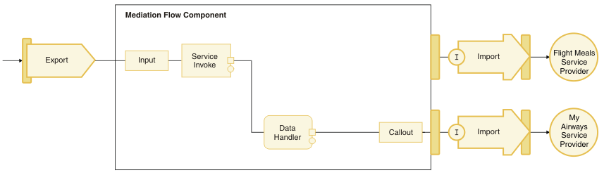 A Data Handler mediation primitive is used to transform data from a CSV format into the required business object. Figure 4.shows how a Service Invoke mediation primitive is used to call the Flight Meals Service Provider, to retrieve the menuCourseIngredients, containing the CSV formatted ingredients information from the Flight Meals Service Provider. The CSV formatted message is then passed to a Data Handler mediation primitive, which is able to transform the CSV data into a business object that can be used by the My Airways Service Provider.
