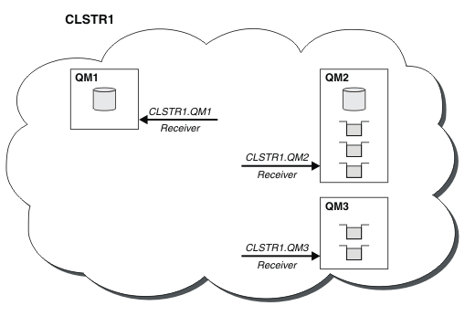 In this cluster, there are three queue managers, QM1, QM2, and QM3.