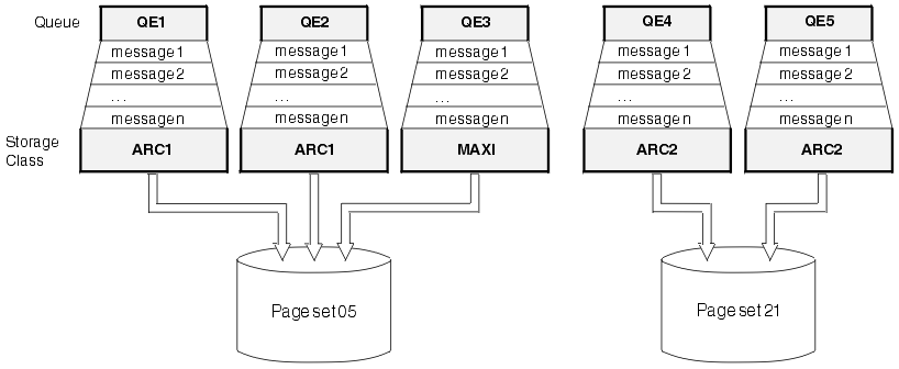 In Figure 1, both storage classes ARC1 and MAXI are associated with page set 05. Therefore, the queues QE1, QE2, and QE3 are mapped to page set 05. Similarly, storage class ARC2 associates queues QE4 and QE5 with page set 21.
