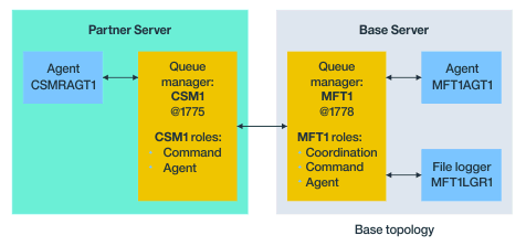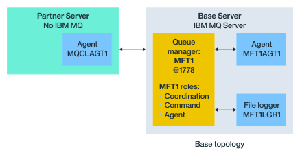 The base topology is the first Managed File Transfer configuration that you complete. After the base configuration is completed, partner agents from remote servers are added to the base configuration to exchange files.