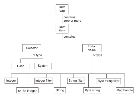 string, a byte string filter, or a handle of another bag. Data items are described in details in
