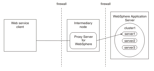 In this topology, the client communicates with an HTTP server, which you configure, by routing requests from a plug-in to a proxy server, to forward the client requests and web services transaction protocol messages to a Proxy Server for IBM WAS. The proxy then dynamically routes the requests to the appropriate server in WAS. The proxy server is configured in the same administrative cell as the target service.