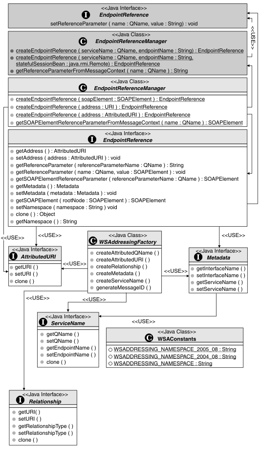 - The EndpointReference interface provides operations for you to set and reason about the contents of an EndpointReference instance, such as its WS-Addressing address and metadata properties. Additional interfaces are provided to represent the artifacts making up an endpoint reference: Metadata, AttributedURI, and ServiceName. You create instances of these interfaces by using operations that are provided by the proprietary WSAddressingFactory class.
