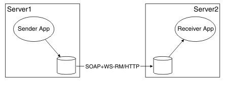 The WS-ReliableMessaging protocol is used to reliably deliver the message to the target server where it is stored and acknowledged.