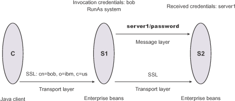 C authenticates to S1 using SSL client certificates. S1 maps the common name of the distinguished name (DN) in the certificate to a user in the local registry. The user in this case is bob. The enterprise bean code on S1 accesses another enterprise bean on S2. Because the RunAs mode is system, the invocation credential is set as server1 for any outbound requests.