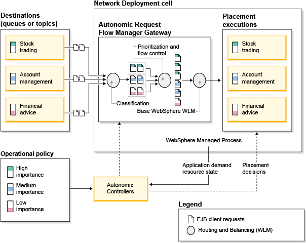 Internet Inter-ORB Protocol (IIOP) and JMS request flow prioritization is achieved with the autonomic managers that control the flow of requests, prioritization of requests, and dynamic workload management. Only IIOP requests from a stand-alone EJB client are prioritized by IIOP autonomic request flow management (ARFM). IIOP requests from EJB clients embedded within a servlet, a web service, or another EJB are not prioritized. This behavior exists because traffic associated with the same overall user request must not be prioritized at multiple tiers, such as the Web tier and EJB tier. However, given the asynchronous nature of JMS, no restrictions exist on where the requests originate.