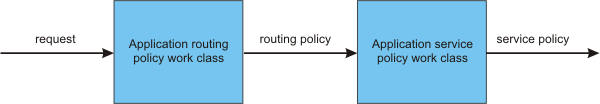 The following diagram shows the flow of a request targeted for an application installed in the Intelligent Management environment. The request is applied to an application routing policy work class to determine the routing policy. If the resulting routing policy is permit or permitsticky, the request continues to an application service policy work class to determine the service policy and the transaction class name.