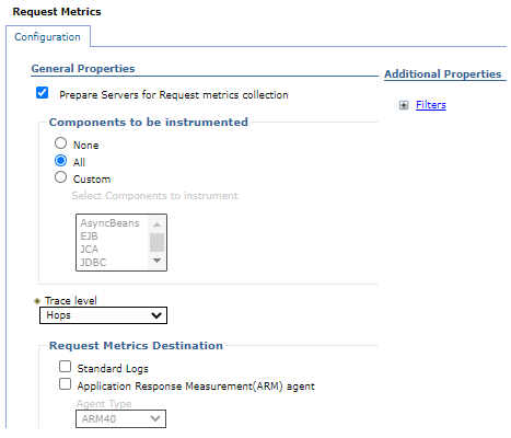 - Select All, None, or Custom under Components to be instrumented to specify the request metrics components. If we select Custom, be sure to select the components we would like to enable.