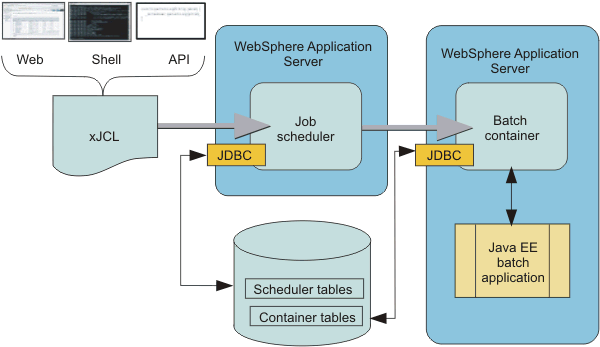 The JDBC is standard JDBC connectivity to the scheduler and container tables, as supported by the WAS connection manager.